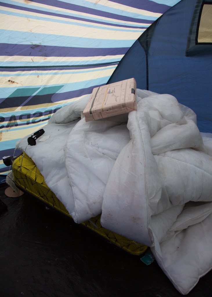 The morning vista reveals the stand off between new solid offices being constructed and the unyielding collapsible nylon shelter. The surroundings present the relentless appearance of new projects overtaking the older projects that have long been boarded up, secured from the threat of people seeking shelter. The resemblance of power sits as a marker, watching over the tented inhabitants, fearing encroachment and abiding time to remove from view.